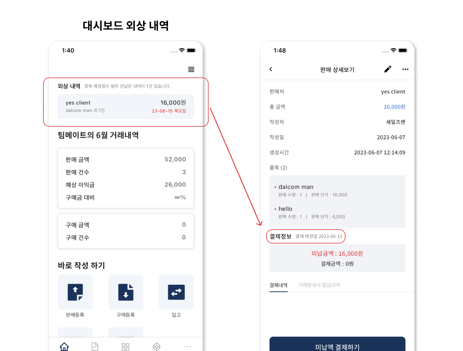 외상 수금•지급 예정일자가 얼마 남지않은 거래내역을 대시보드에서 확인할 수 있습니다.