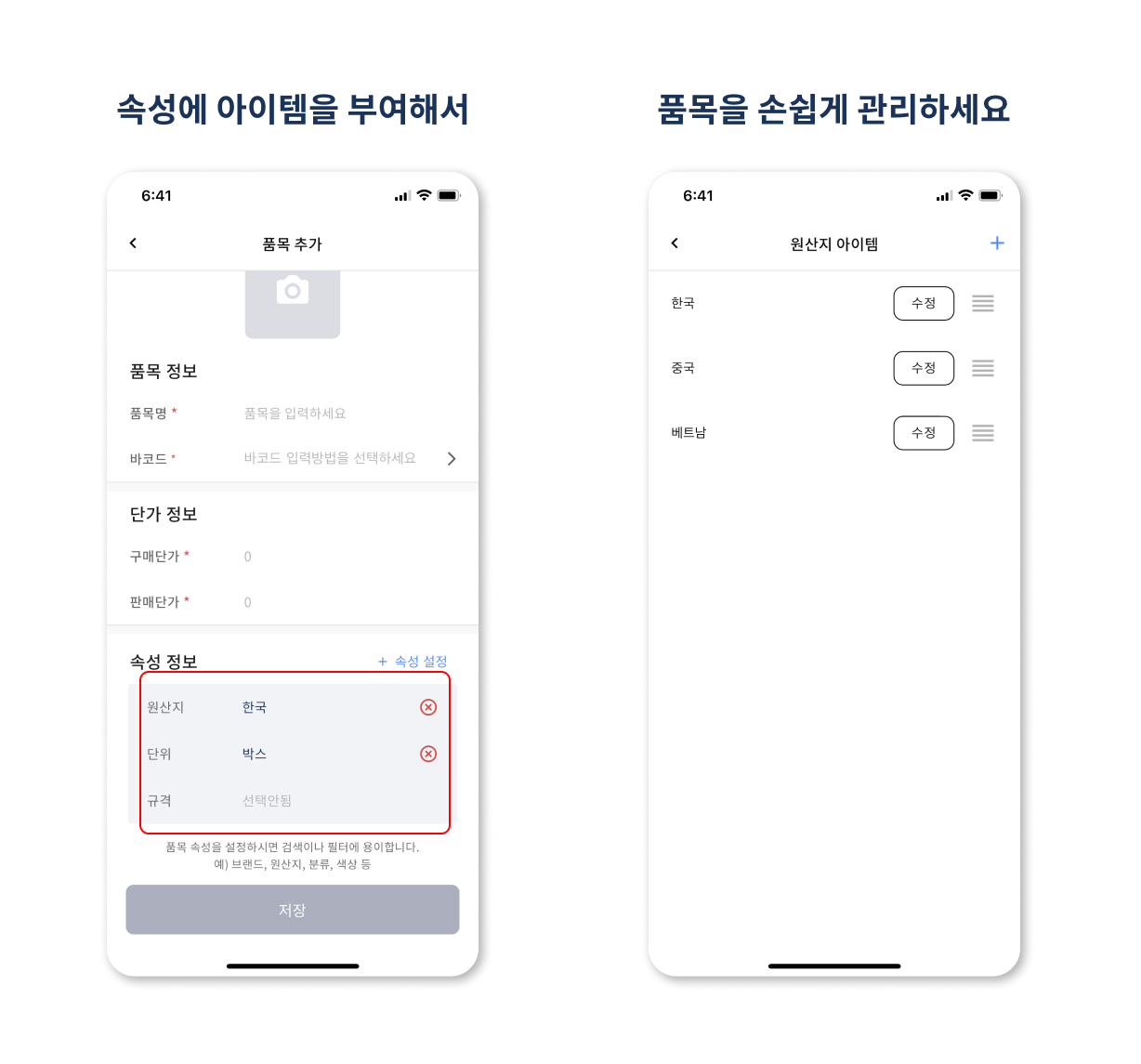 품목에 다양한 속성을 추가해서 좀 더 꼼꼼하게 관리할 수 있습니다.