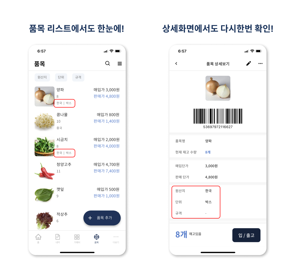 추가된 속성과 속성아이템을 품목에 적용했을때 아래와 같이 품목 리스트 및 품목 상세 화면에서 바로 확인할 수 있습니다.