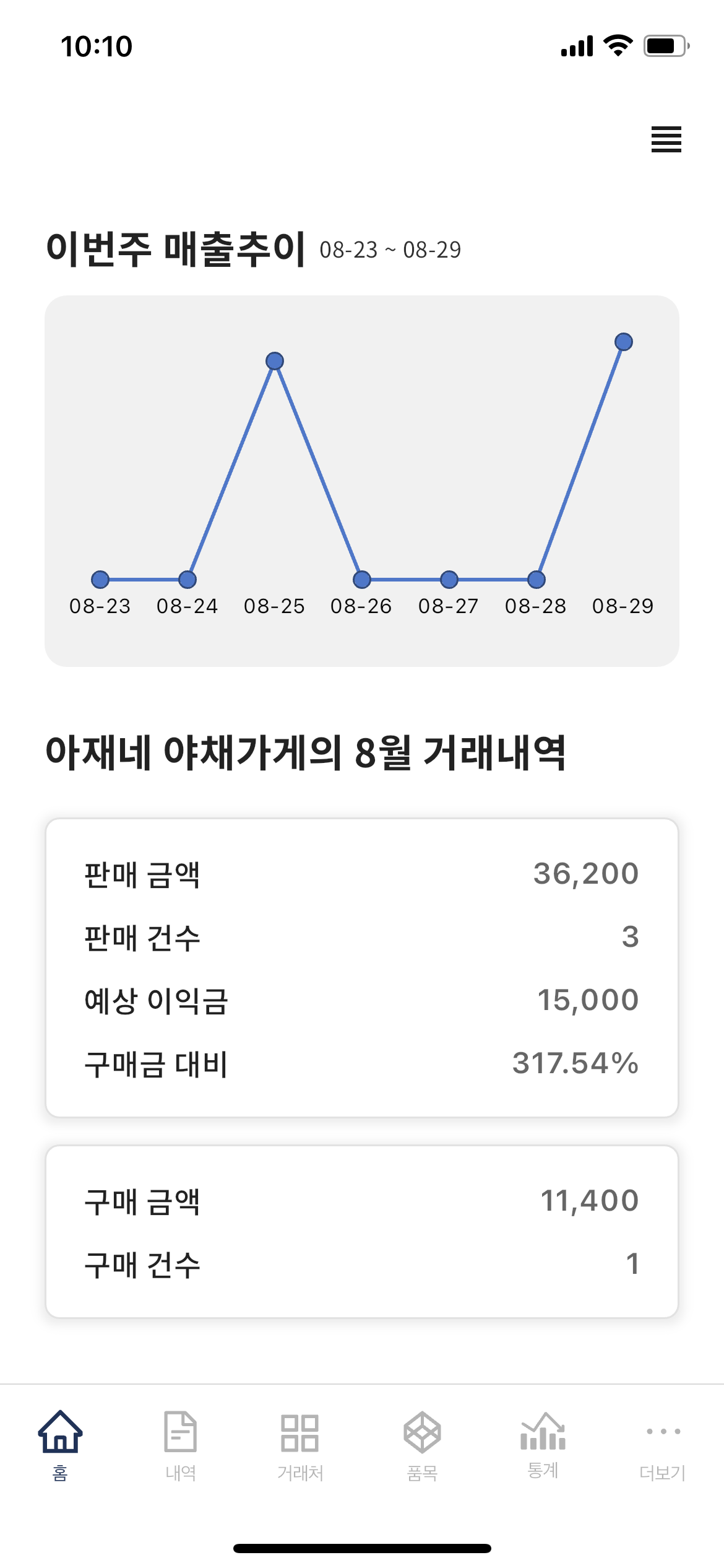 메인 홈 화면에서는 최근 1주일 사이의 판매 추이를 볼 수 있는 차트가 추가되었습니다.