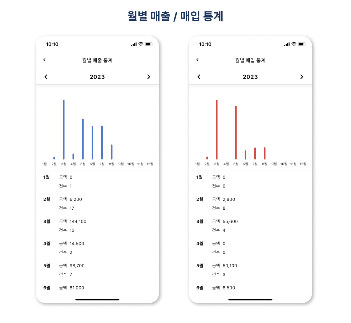 매출(판매) 와 매입(구매)의 월별 금액 합과 건수를 직관적으로 확인할 수 있습니다.