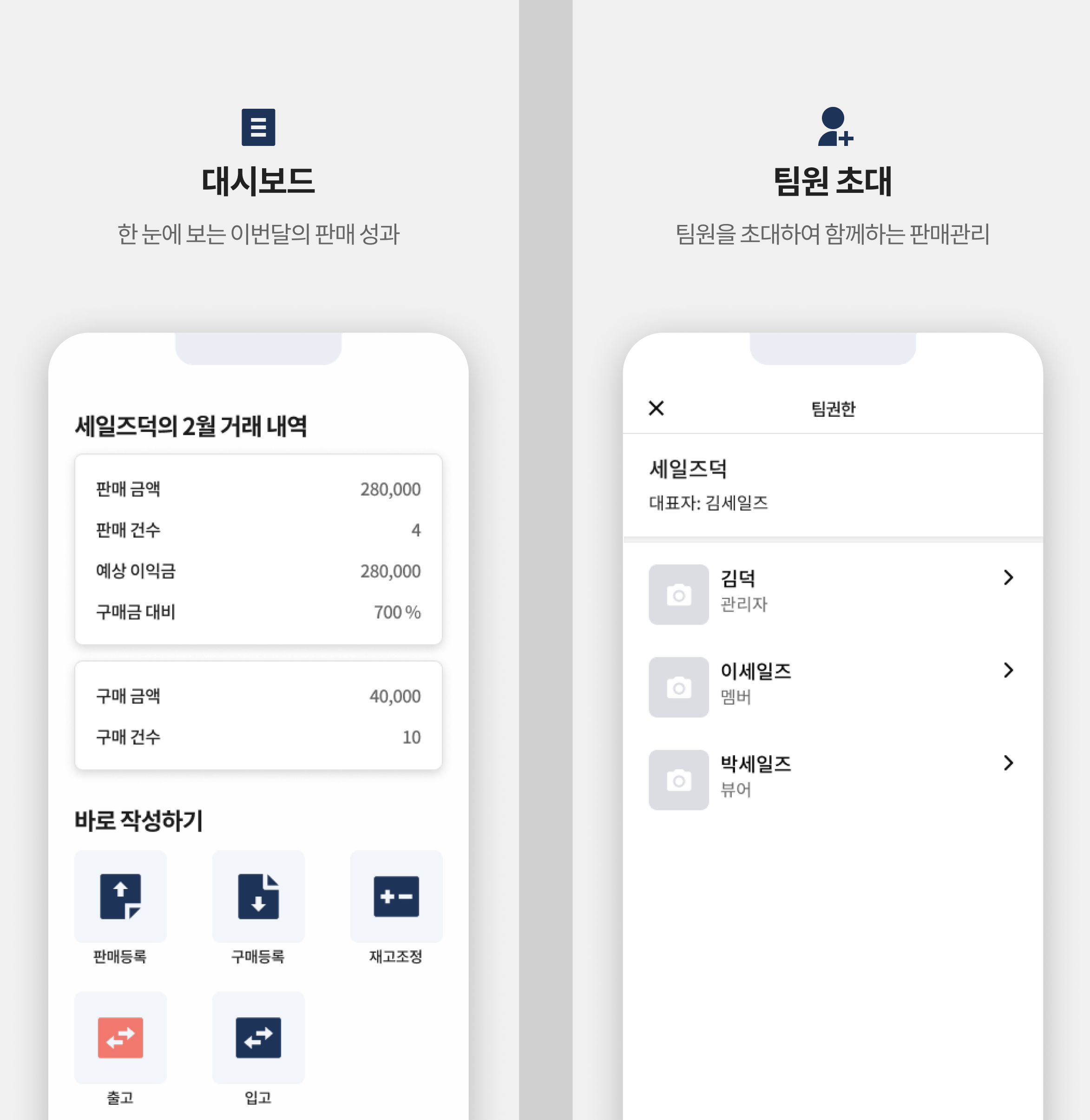 그래서, 이번에 새롭게 출시하는 세일즈덕 팀 서비스는 1인 운영 뿐 아니라, 여러개의 팀을 생성해서 제한없이 팀원들을 초대하고, 매출 매입기록을 공유하고, 재고 이력을 투명하게 남길 수 있도록 개발했습니다.