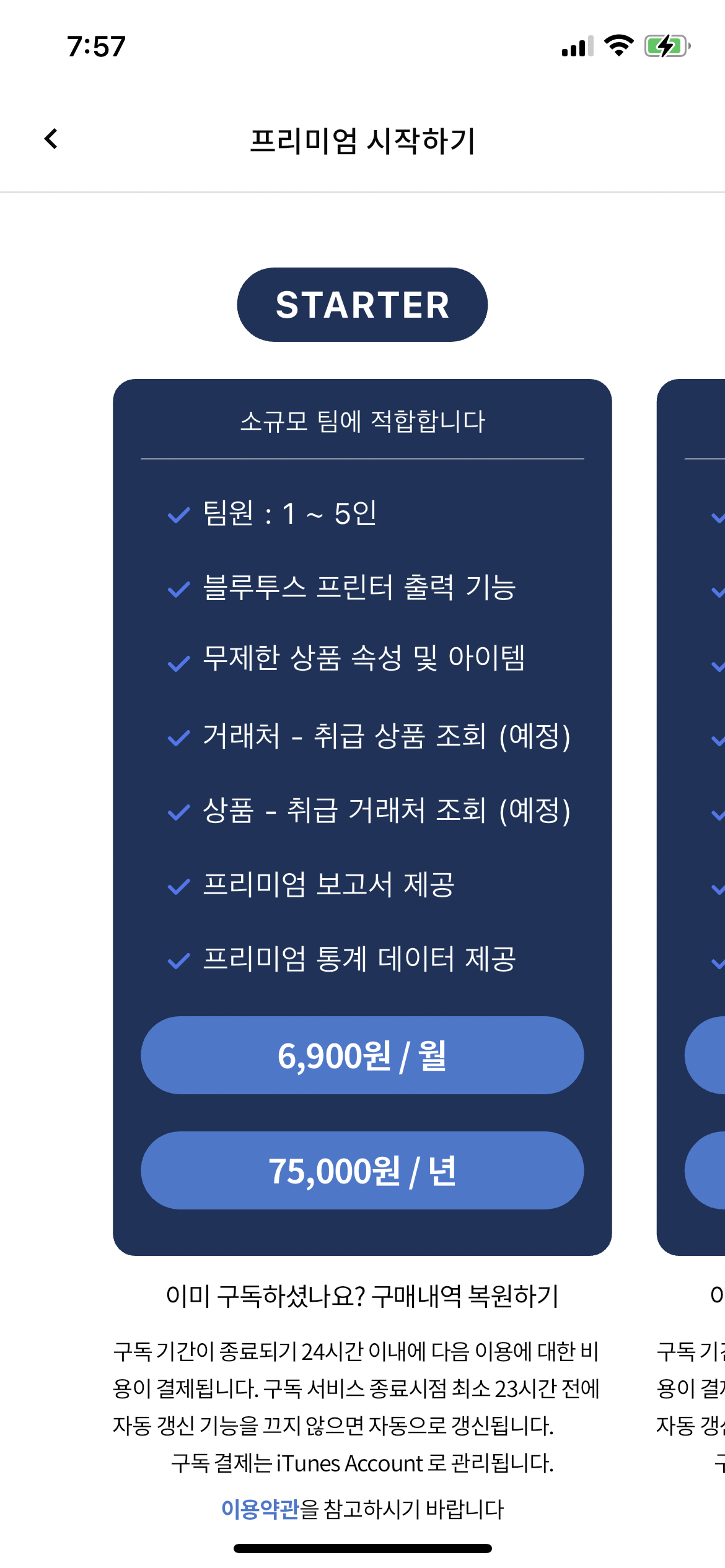 각종 프리미엄 보고서나, 프리미엄 통계, 블루투스 프린터 기능 등을 무제한으로 이용할 수 있습니다.