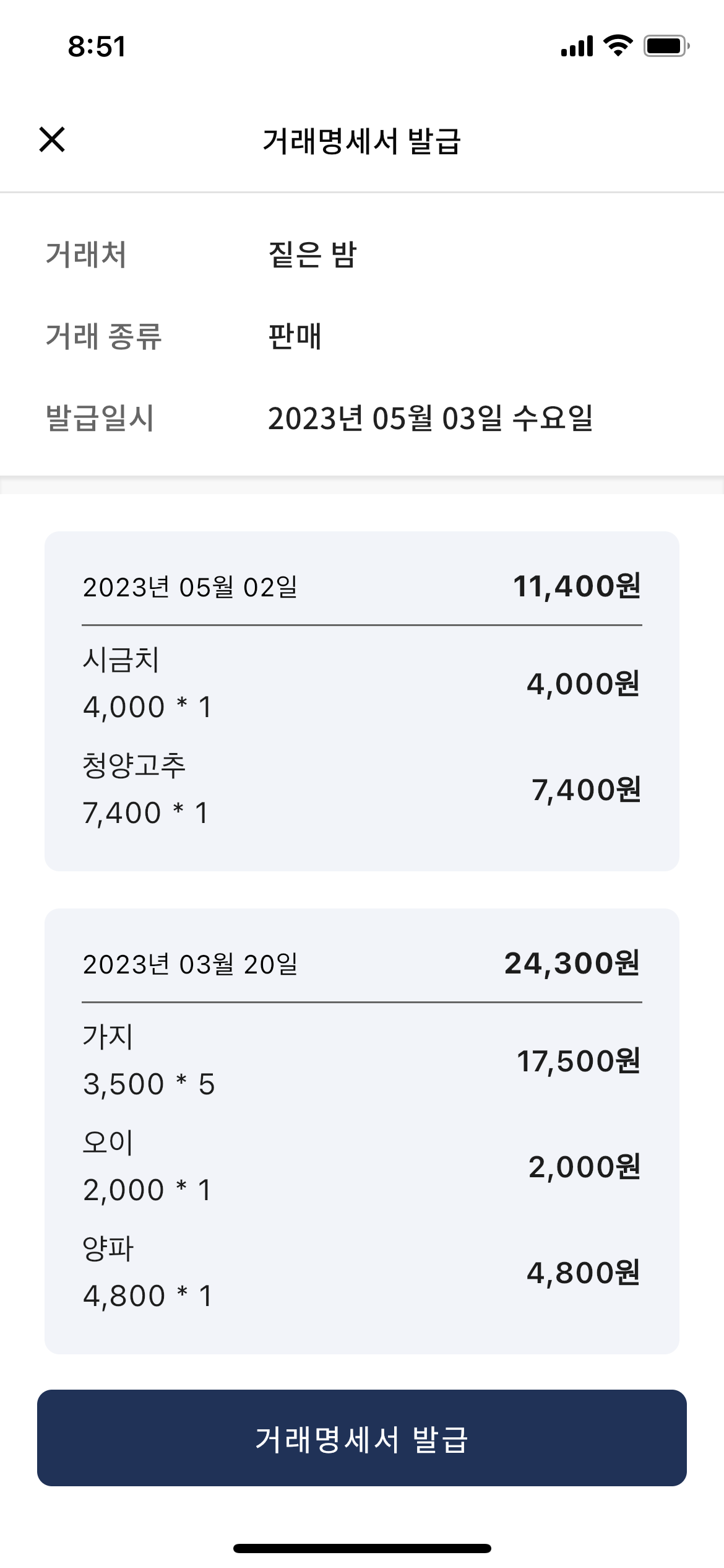 위와 같이, 단일 거래기록 (판매나 구매)에 대한 거래명세서를 발급할 수도 있지만,
