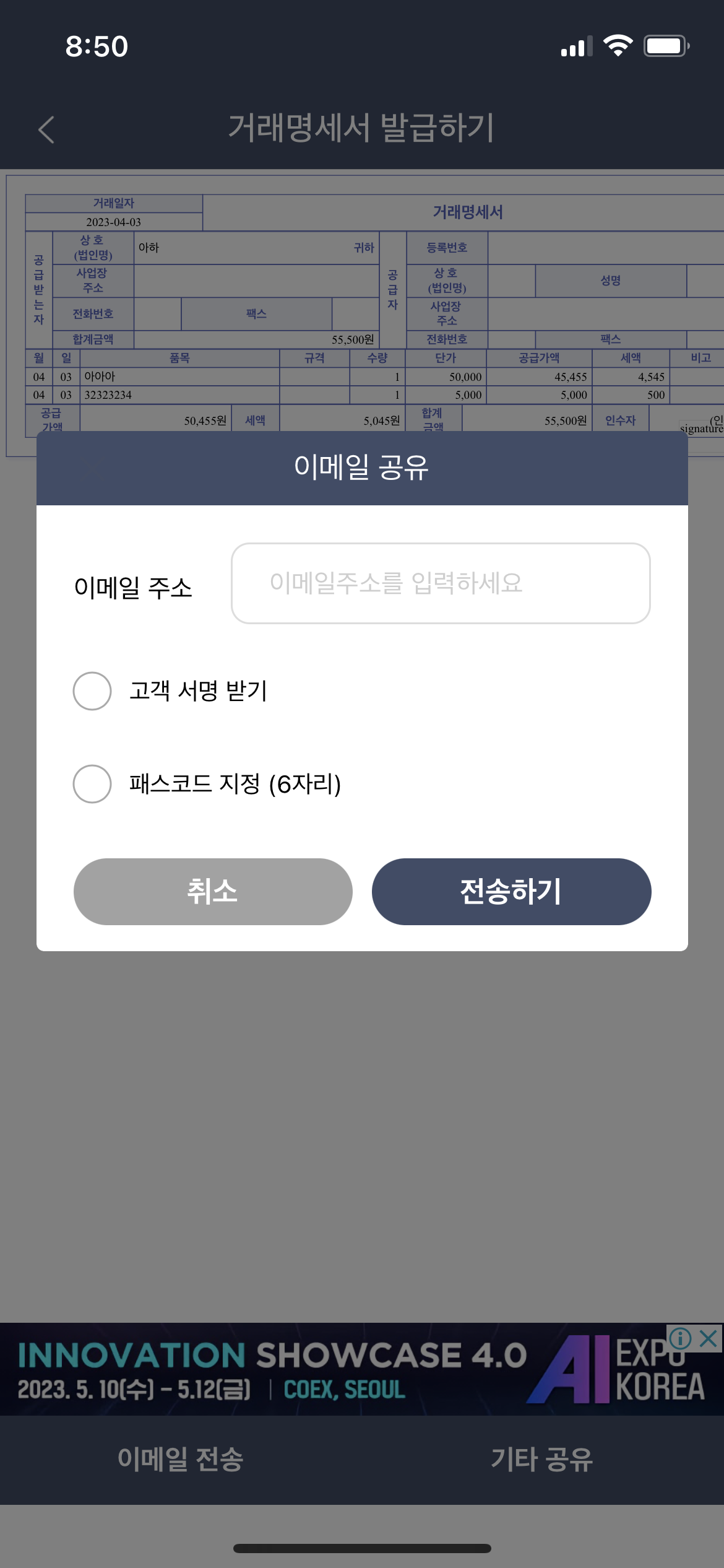 눈에 익숙한 양식의 거래명세서를 Web 사이트를 통해서 공유할 수 있고, 필요하다면 PDF로 다운받아서 직접 전송하거나 상대방이 직접 다운로드 할 수도 있었는데요.