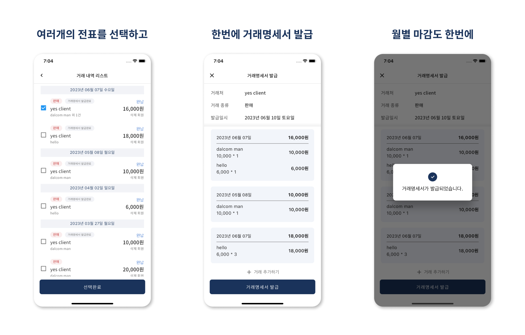 리스트 상에서 확인하고, 아직 발급 되지 않은 거래내역이 있다면 명세서를 발급해서 배포해보세요!