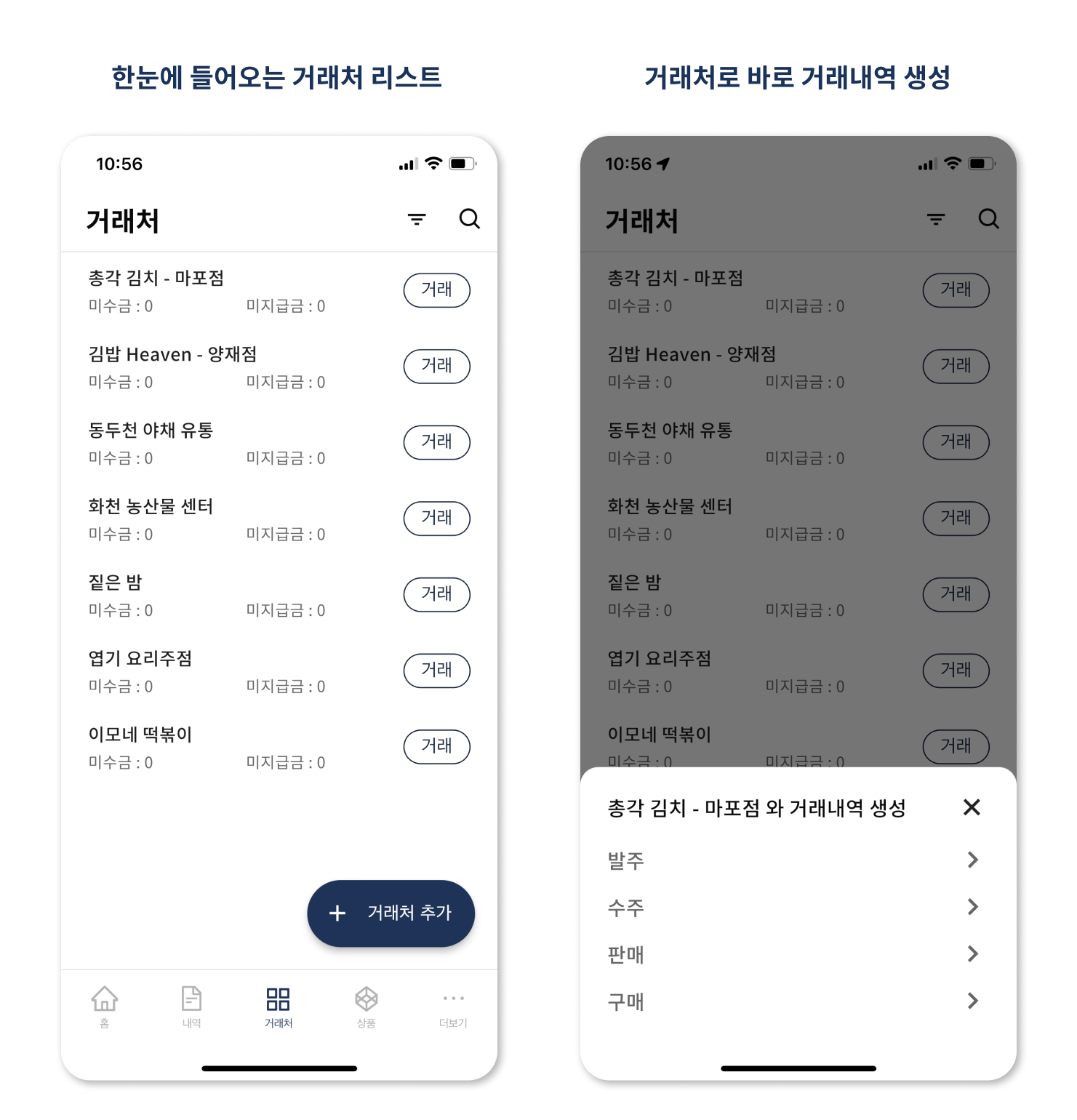 거래대상과 거래상품의 관리가 한번에 이루어지고, 그 결과가 상품 재고에 실시간으로 반영되죠!